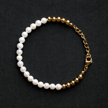 Our Pearl & 24KT Gold Plated Bead Bracelet has been crafted using both polished white pearls and gold beads. Finished with a gold clasp, this piece is the perfect touch of white & gold when worn on it's own or when stacked with other white or gold jewelry.
