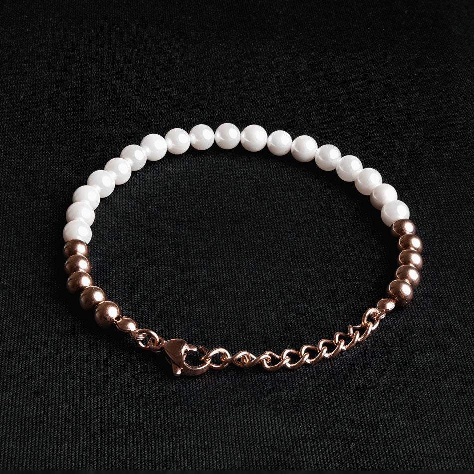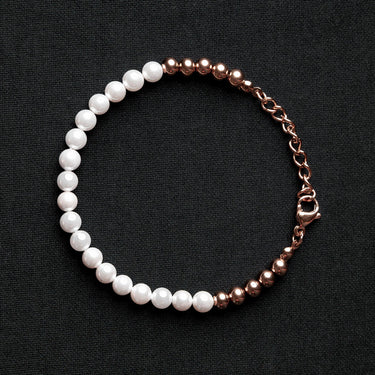 Our Pearl & Rose Gold Bead Bracelet has been crafted using both polished white pearls and rose gold beads. Finished with a rose gold clasp, this piece is the perfect touch of white & rose gold when worn on it's own or when stacked with other white or rose gold jewelry.