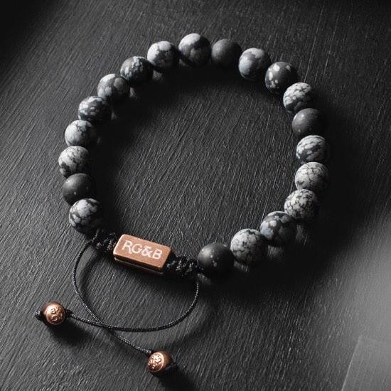 Our Snowflake Obsidian Stone Bracelet features our Snowflake Obsidian Stones and our signature brushed Rose Gold stainless steel hardware, engraved with the signature RG&B logo.