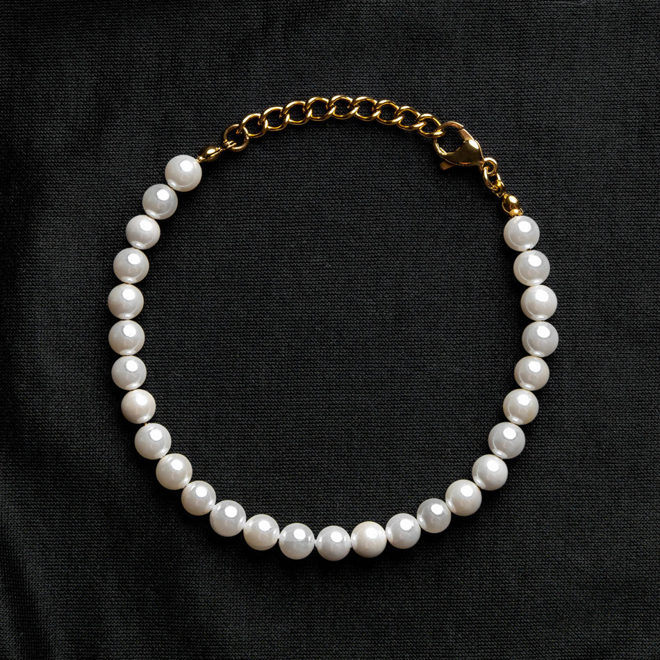 Our Pearl Bracelet with 24KT Gold Plated Hardware has been crafted using polished white pearls, along with the finest gold chain to hold it all together. This piece is the perfect touch of white & gold when worn on it's own or when stacked with other white or gold jewelry.