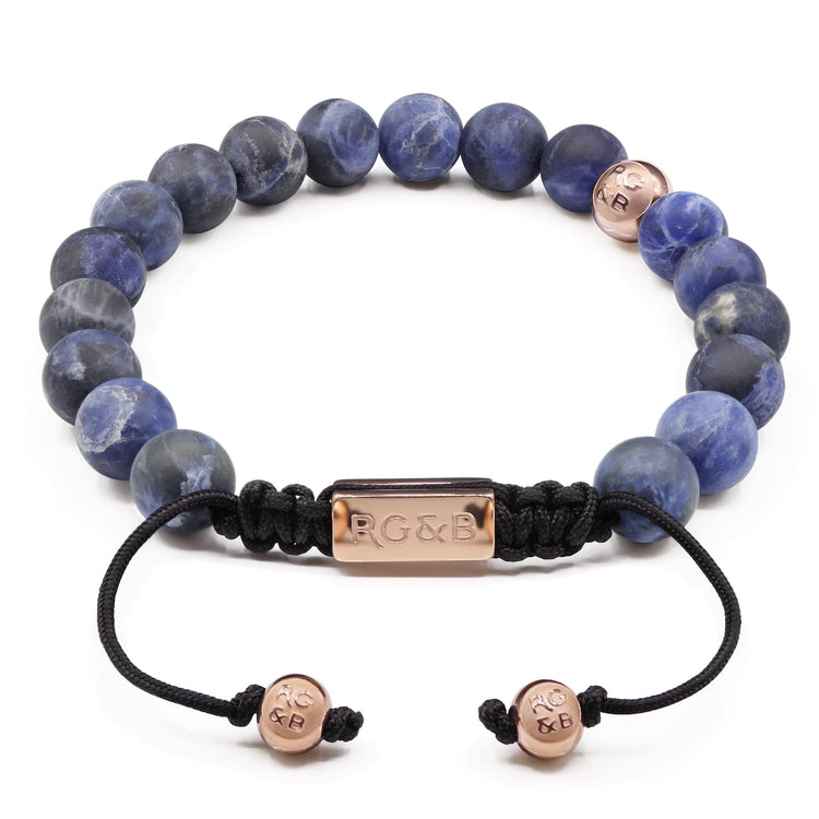 Our Premium Sodalite Stone Bead bracelet features natural sodalite stone beads, polished rose gold stainless steel hardware, engraved with the signature RG&B logo plus our engraved polished rose gold signature bead.