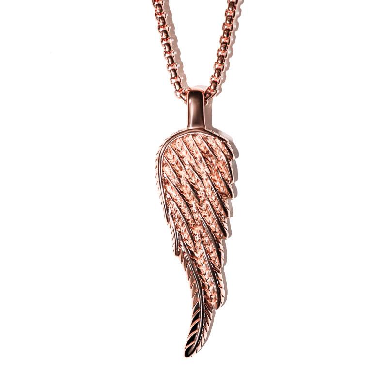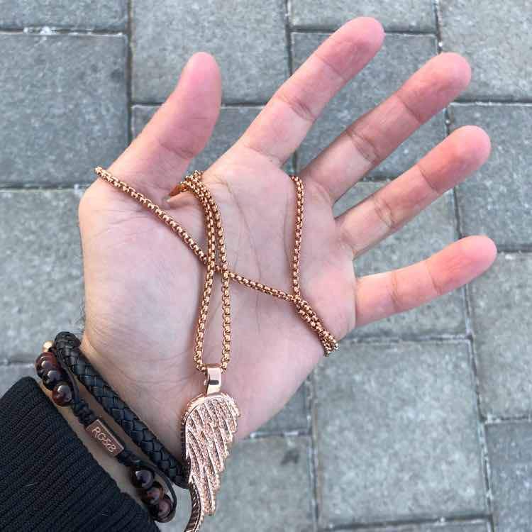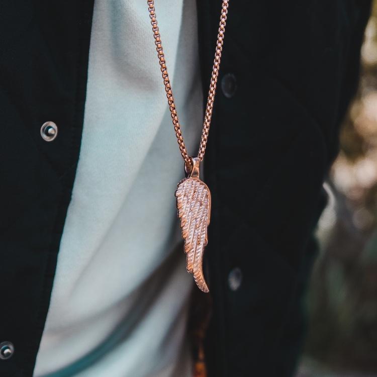 Our Angel Wing Necklace finished in Rose Gold, features our double sided angel wing pendant along with a polished box chain. Some well-picked accessories can make all the difference when you are trying to upgrade your outfit, so don’t overlook The Angel Wing Necklace which is built to last. Perfect when worn on it's on or with other pieces of rose gold jewelry, level up any outfit today.